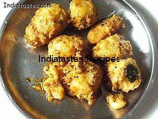 Boil the cololasia in a pressure cooker until it becomes very soft. Cool and peel them. Heat the oil in a frying pan, add mustard seeds. When it splutters add urad dal. When urad dal is roasted, add the cooked cololasia, salt, chilli powder and fry until they are roasted. In the end, add curry leaves and stir.