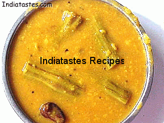 Heat 2 teaspoons of oil and add 1 tsp mustard seeds.When the mustard splatters add 1/2 fenugreek seeds and 1/4 tsp asafoetida. Add any of the vegetables (cut into large pieces) and fry lightly.Add 2 cups of water and allow it to boil.Add 1 teaspoon salt, 1 1/2 teaspoon Sambar powder and tamarind juice(amount vary to taste). Heat until the raw smell of tamarind is gone.Then add 1 cup boiled toor dal(like paste) and heat until it mixes uniformly.Add a teaspoon of Kari masala powder.